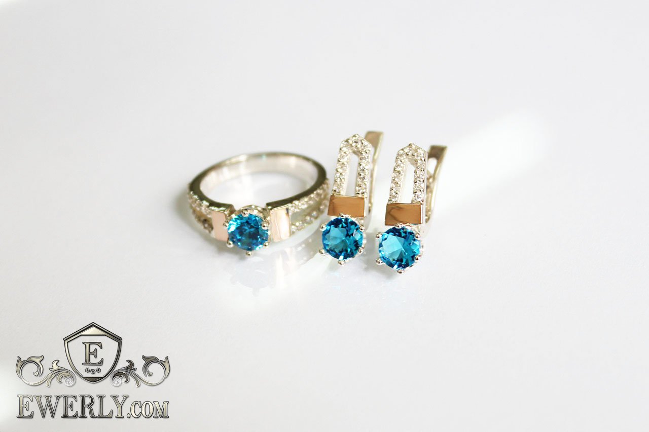 Женские серебряные серьги и кольцом с голубыми камнями и золотом