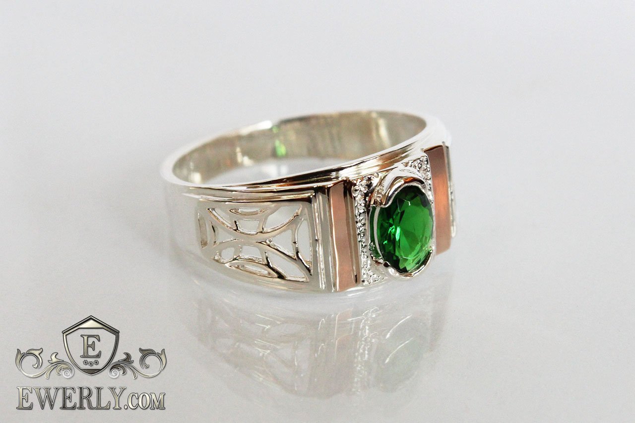 Мужское перстень из серебра 925 пробы с золотом 375 пробы и вставкой - зелёным камнем (фианит).
